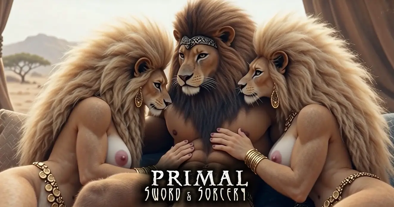 They were lionesses of the Southern courts—vast pale-gold manes braided with stones and coin, chiming as they moved. Their hides glistened with oil. Their breasts rose and fell in smug unison. They were idols, poured and polished—and tonight, they sprawled victorious beside the barbarian who had carried them here.
